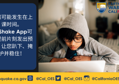 Cal OES还鼓励学校参加将于2021年10月21日举行的一年一度的Great California ShakeOut演习。 作为地震演习的一部分,Cal OES 鼓励公众下载并启用免费的MyShake App。