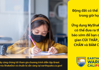 Để tìm hiểu thêm về Earthquake Warning California, ứng dụng MyShake App hoặc các tài nguyên cảnh báo động đất khác, vui lòng truy cập earthquake.ca.gov.