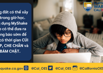 [School Name] khuyến khích [staff/students and their families] chuẩn bị sẵn kế hoạch tự bảo vệ bản thân trong trường hợp xảy ra động đất. Để thực hiện công tác chuẩn bị, Cal OES khuyến khích người dân tham gia chương trình diễn tập Great California ShakeOut hằng năm và năm nay, sự kiện sẽ diễn ra vào ngày 21 tháng 10 sắp tới. Cal OES cũng khuyến khích [staff, students, families, and volunteers] tải xuống và bật ứng dụng MyShake App (miễn phí trên Apple App Store và Google Play cho thiết bị di động). Nếu bạn nhận được cảnh báo từ MyShake, hãy luôn phản ứng với giả định rằng rung chấn sắp xảy ra và thực hiện các biện pháp bảo vệ như CÚI THẤP, CHE CHẮN và BÁM CHẶT.