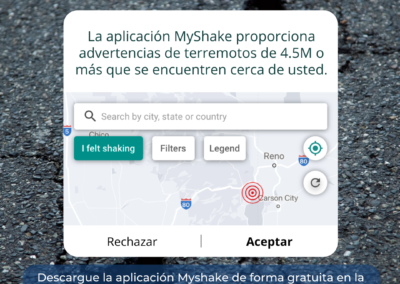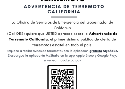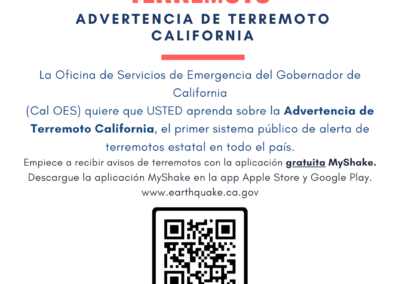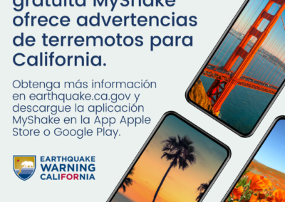Para obtener más información sobre Earthquake Warning California (Advertencia de Terremoto California), la aplicación MyShake u otros recursos de alerta de terremotos, visite earthquake.ca.gov.