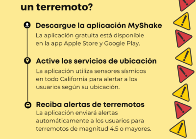 Este verano, ¡no dejes que un terremoto te encuentre desprevenido! La Oficina de Servicios de Emergencia de California (Cal OES) lanzó el primer sistema público de alerta de terremotos en todo el estado, Earthquake Warning California (Advertencia de Terremoto California). Los californianos pueden recibir advertencias de terremotos con la aplicación del estado gratuita MyShake, que se puede descargar en la app Apple Store o Google Play en teléfonos inteligentes o tabletas. La aplicación MyShake está disponible actualmente en inglés y español, y en otros idiomas próximamente. La tecnología conecta los dispositivos móviles con sensores terrestres para enviar advertencias a quienes se encuentran en el área cercana cuando se detecta un temblor significativo, y así las personas tengan unos momentos adicionales para tomar medidas de protección, como agacharse, cubrirse y sujetarse.