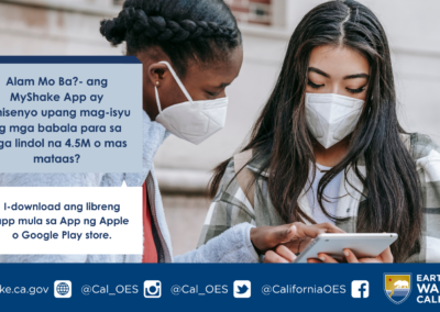 Maaaring maiakma at i-copy paste ang sumusunod sa mga channel ng social media para himukin ang mga follower na i-download ang MyShake App at matuto tungkol sa Earthquake Warning California. Maaari mo ring i-tag ang Cal OES sa iyong post (Twitter: @Cal_OES / Facebook: @CaliforniaOES).