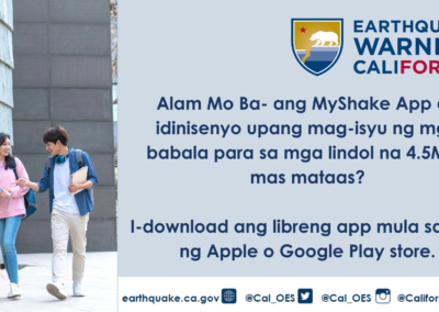 Para matuto ng higit tungkol sa Earthquake Warning California, ang MyShake App, o ibang mga mapagkukunan ng babala ng lindol, bumisita sa earthquake.ca.gov.