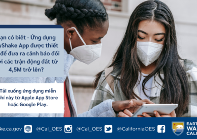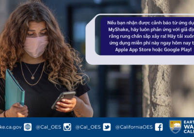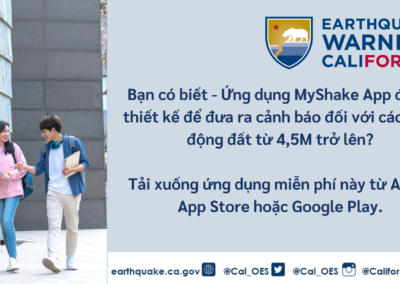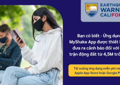 Để tìm hiểu thêm về Earthquake Warning California, ứng dụng MyShake App hoặc các tài nguyên cảnh báo động đất khác, vui lòng truy cập earthquake.ca.gov.