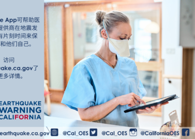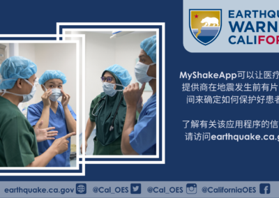 该工具包旨在帮助医疗机构轻松地与其客户、员工、供应商和其他人共享有关地震预警资源的信息。 为其他行业(医疗、教育等)量身定制的工具包可在 earthquake.ca.gov/get-prepared 上获得。 所有行业工具包均提供英语、西班牙语、中文(简体和繁体)、韩语、他加禄语和越南语版本。