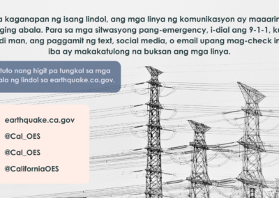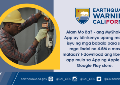 Ang mga sumusunod na graphics ay sinukat para sa Twitter (1200 x 675 na mga pixel). Kapag interesado ka sa iba’t ibang sukat, mangyaring mag-email sa saearthquakeinfo@caloes.ca.gov.