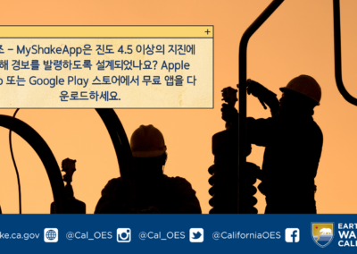 자세한 정보와 Earthquake Warning California 대해 알아보려면 Earthquake Warning California 뉴스레터에 가입하거나 earthquake.ca.gov 방문하세요.