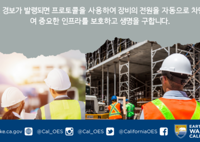 이 툴킷은 공공서비스 제공 업체가 고객, 직원, 공급업체 및 기타 사람들과 지진 경보 리소스에 대한 정보를 쉽게 공유할 수 있도록 설계되었습니다. 다른 산업(의료, 교육 등)에 맞는 툴킷은 earthquake.ca.gov/get-prepared에서 구할 수 있습니다. 모든 산업 툴킷은 영어, 스페인어, 중국어(간체 및 번체), 한국어, 타갈로그어 및 베트남어로 제공됩니다.