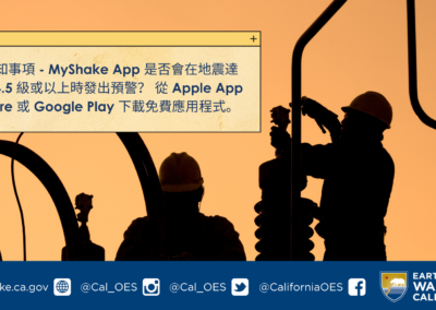 您可根據需求將下列資訊複製貼上到各式社群媒體,鼓勵追蹤者下載 MyShake App 並深入瞭解 Earthquake Warning California。 您也可以在貼文標記 Cal OES (Twitter: @Cal_OES / Facebook: @CaliforniaOES)。