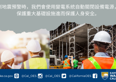 今年十月,加州緊急服務辦公室 (Cal OES) 鼓勵公共產業業者與其員工深入瞭解這項地震預警最新技術,這項技術能在地表晃動前幾秒發出預警。 內容包含: