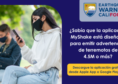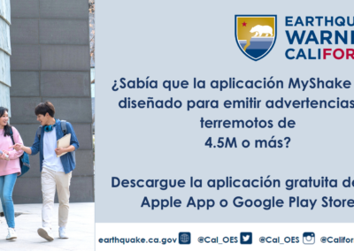 Para obtener más información sobre Earthquake Warning California (Advertencia de Terremoto California), la aplicación MyShake u otros recursos de alerta de terremotos, visite earthquake.ca.gov.
