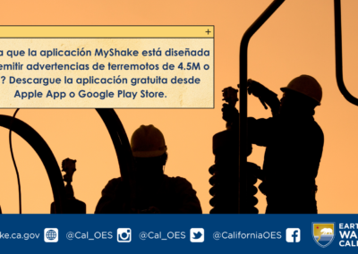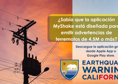 Para obtener más información sobre Earthquake Warning California (Advertencia de Terremoto California), la aplicación MyShake u otros recursos de alerta de terremotos, visite earthquake.ca.gov.