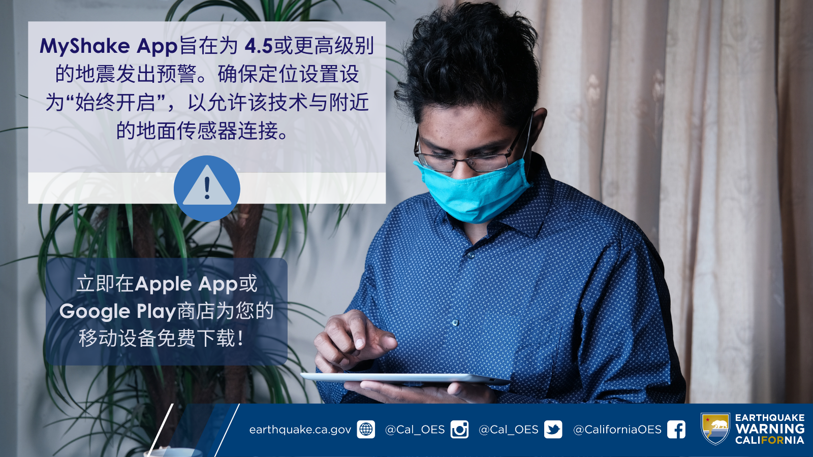如需了解关于MyShake App和Earthquake Warning California的更多信息,请访问 earthquake.ca.gov。