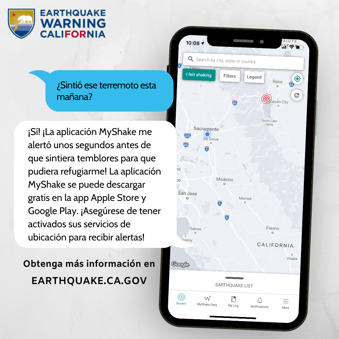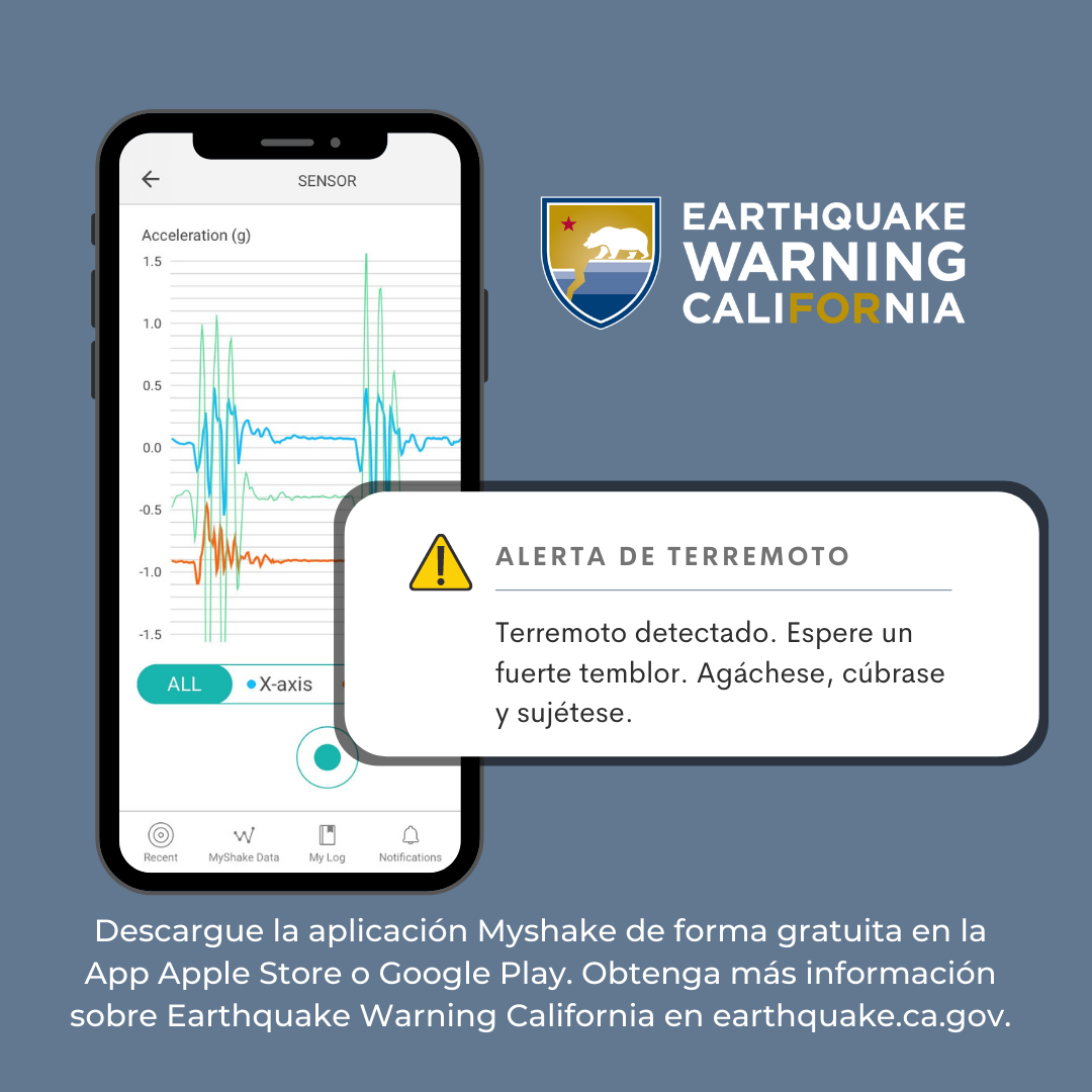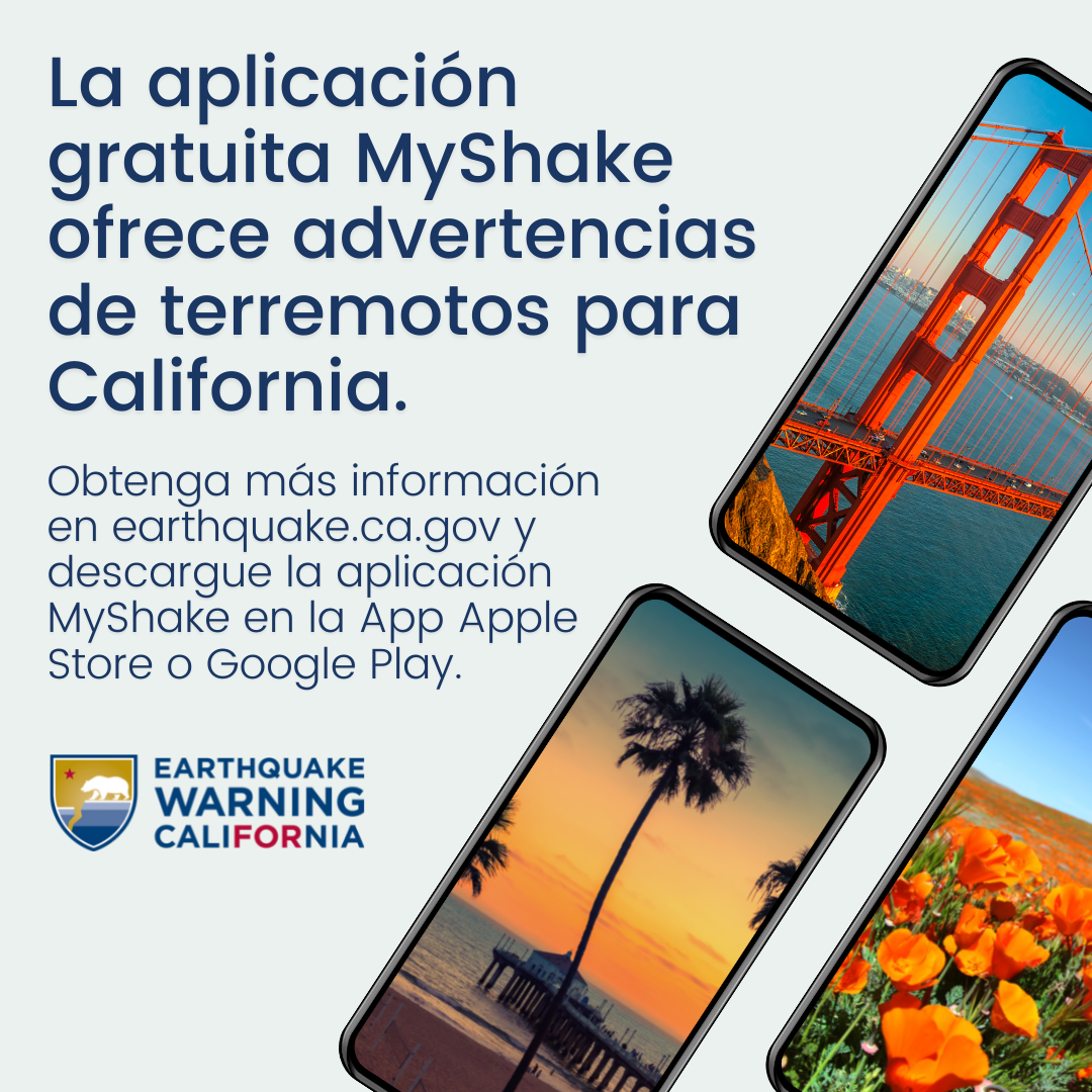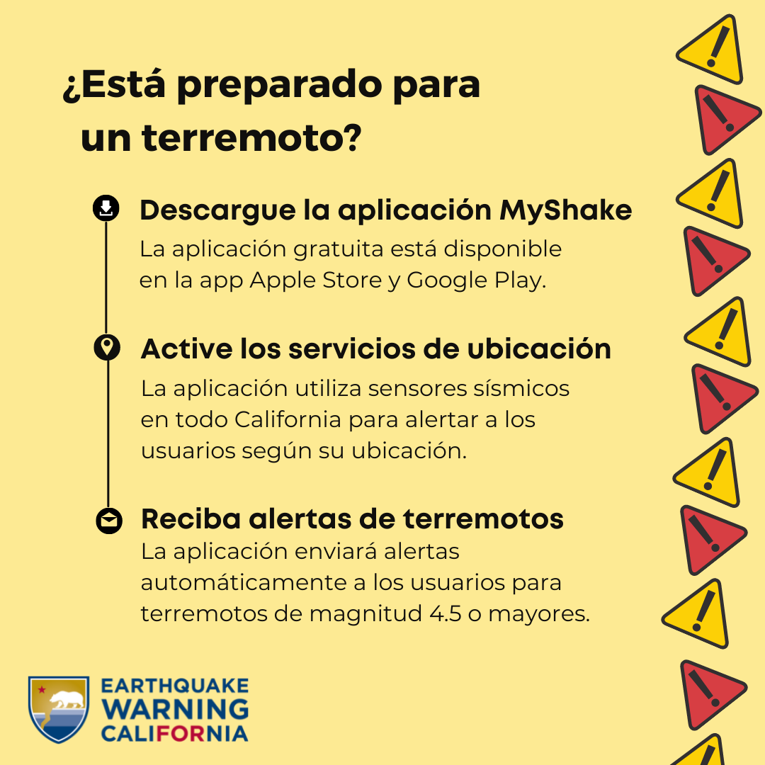 • Los californianos pueden recibir advertencias sobre terremotos de 4.5M o más a través de la aplicación gratuita #MyShakeApp. Obtenga más información en earthquake.ca.gov.