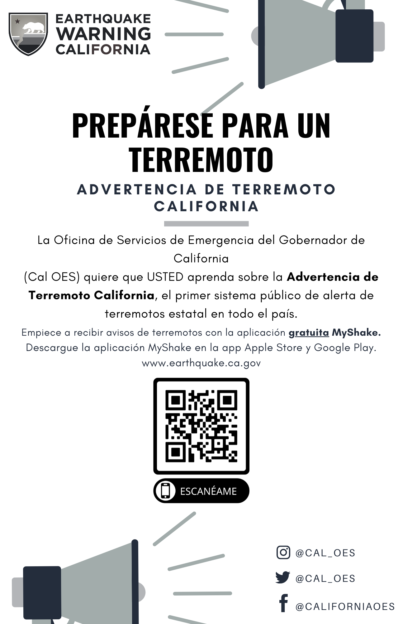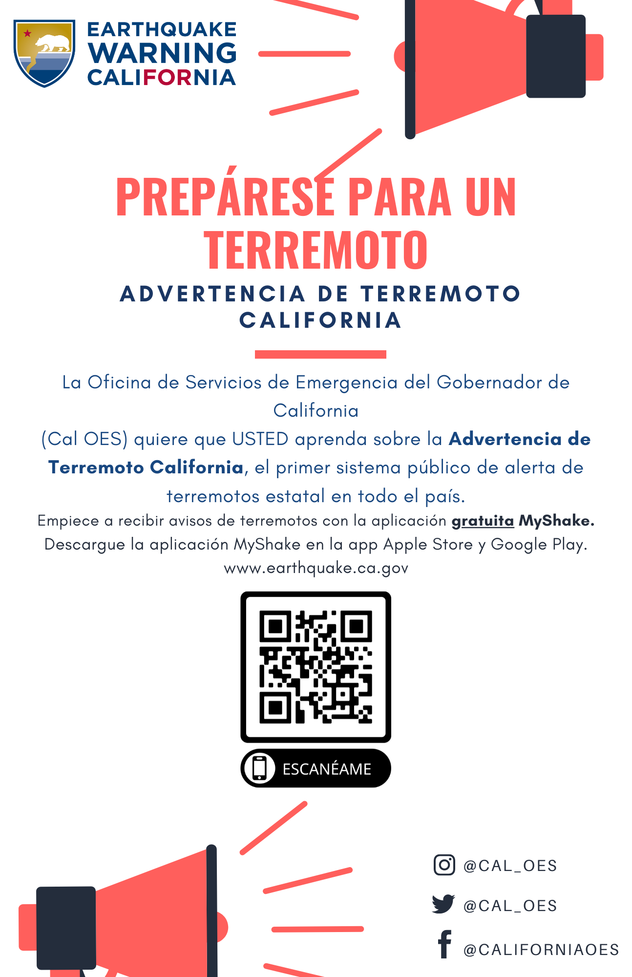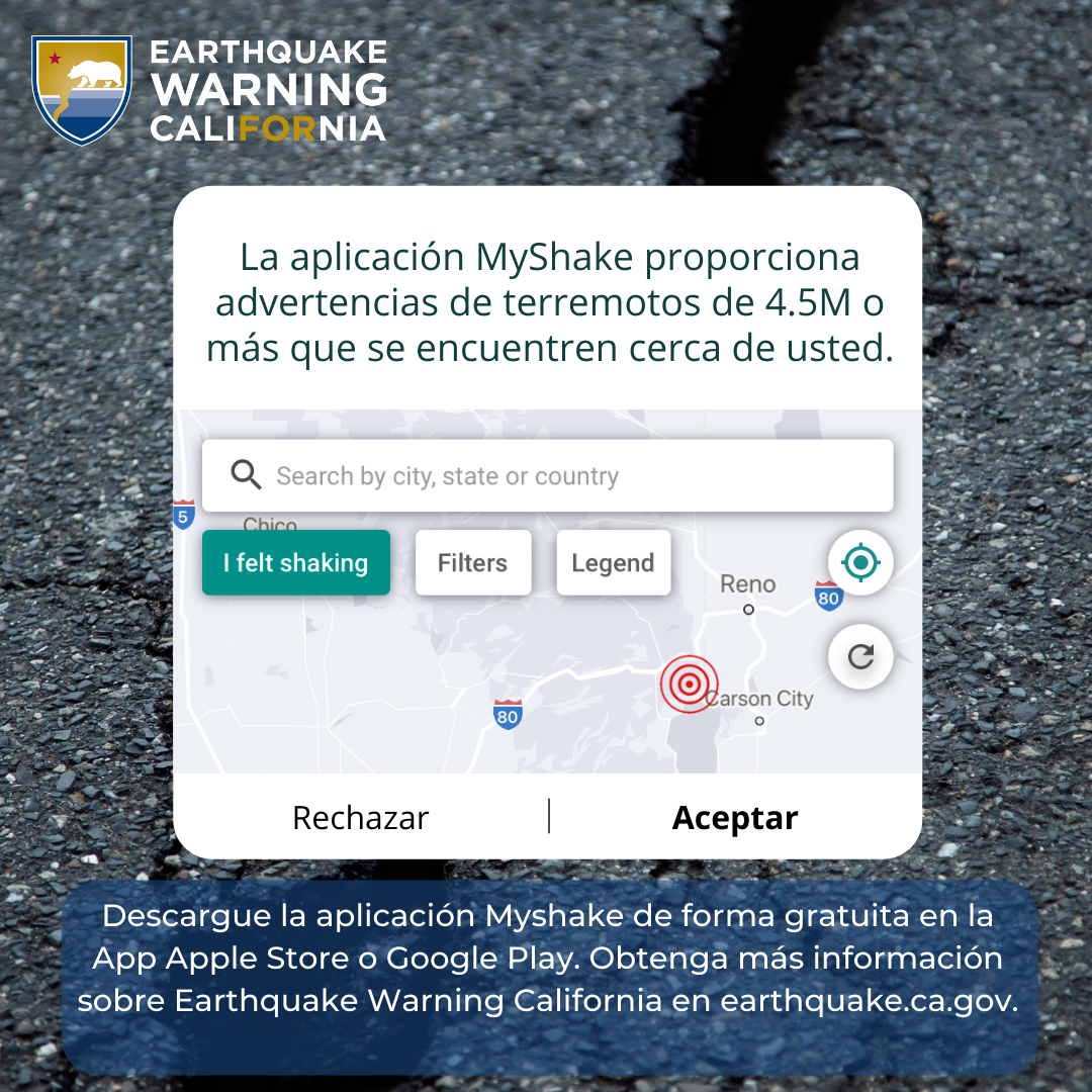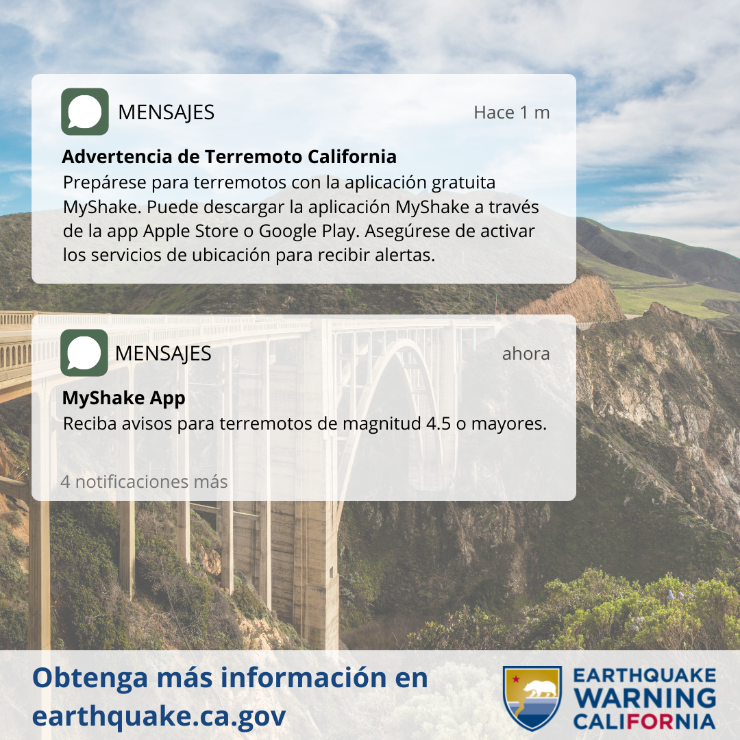 • Los californianos pueden recibir advertencias sobre terremotos de 4.5M o más a través de la aplicación gratuita #MyShakeApp. Obtenga más información en earthquake.ca.gov.