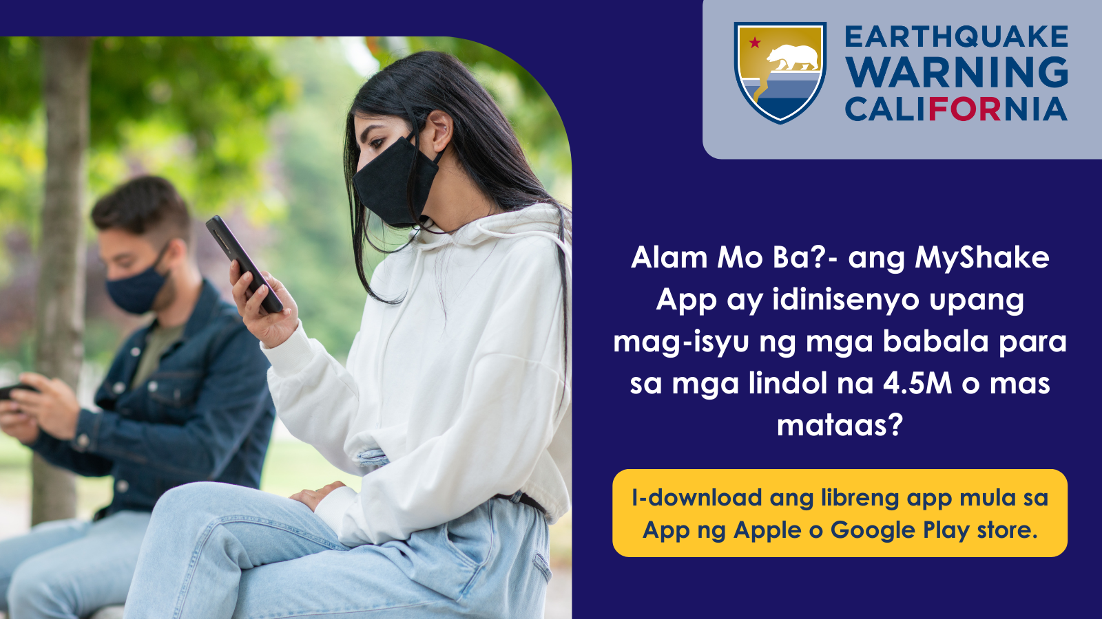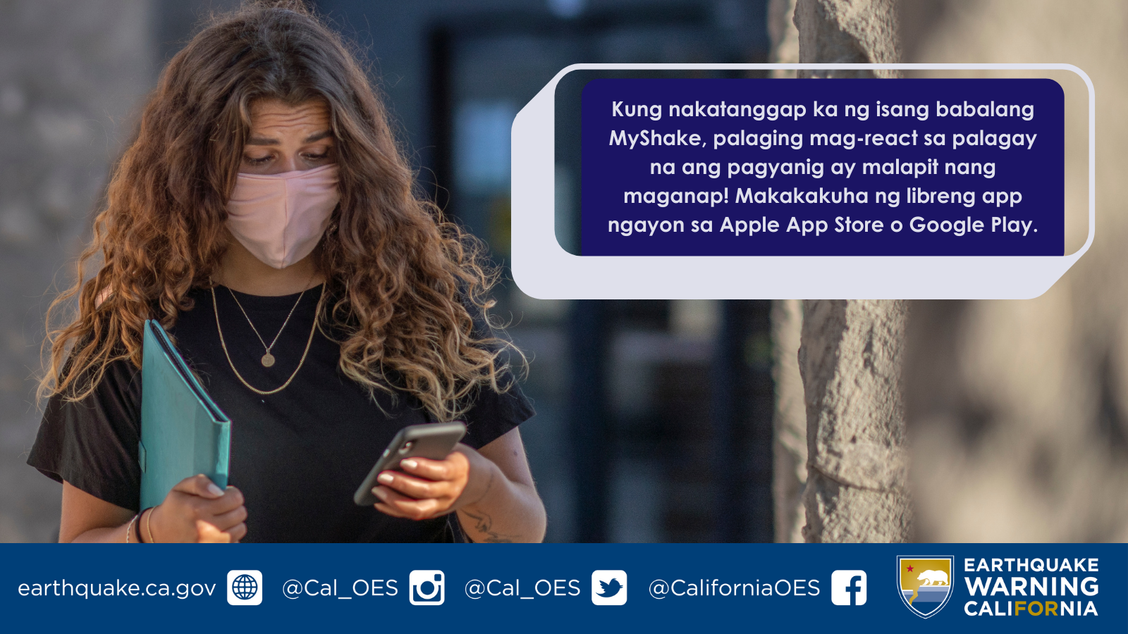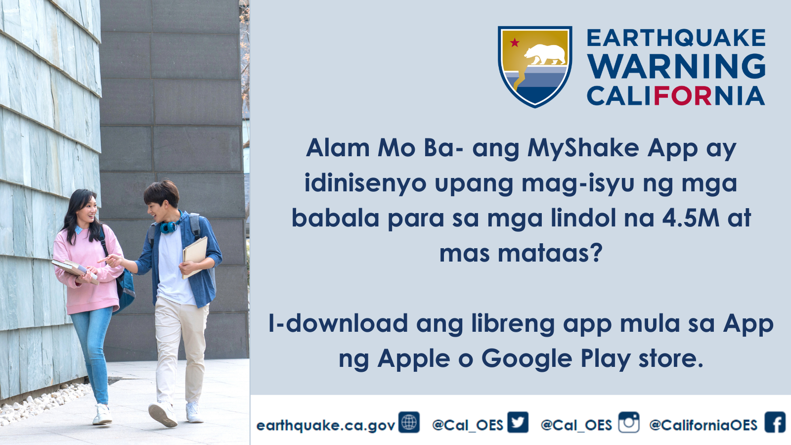 - Ngayong taglagas,[Education Institution Name]ay masayang lumahok sa Great #California #ShakeOut drill sa Oktubre 21! Tiyaking mayroon kang mga babalang #earthquake sa iyong mobile device! I-download ang #MyShakeApp sa Apple App Store o Google Play.