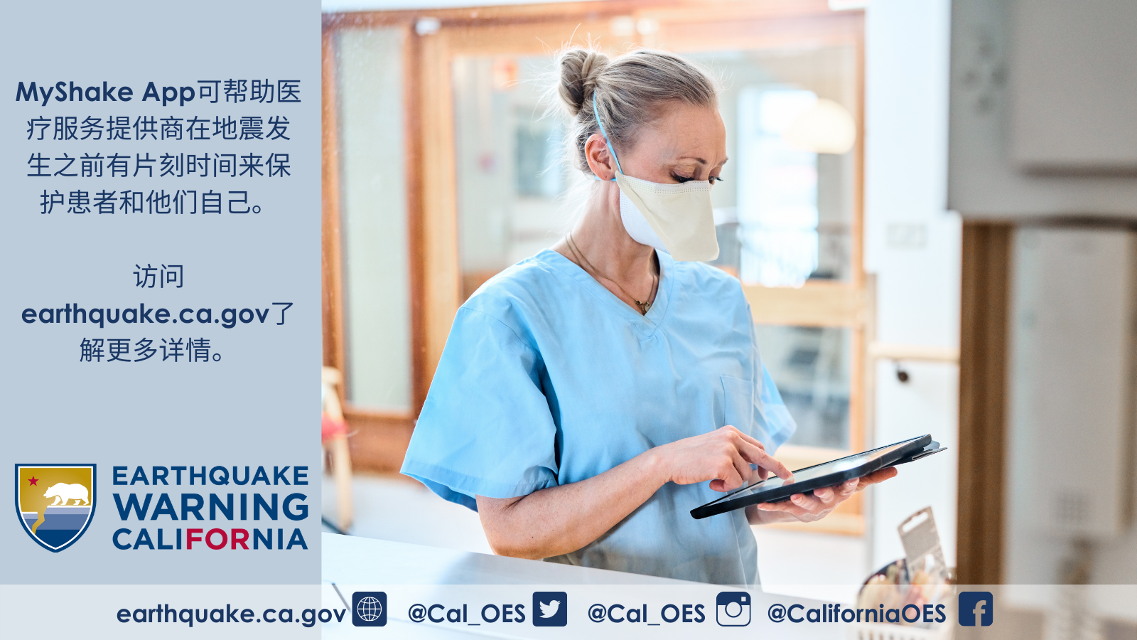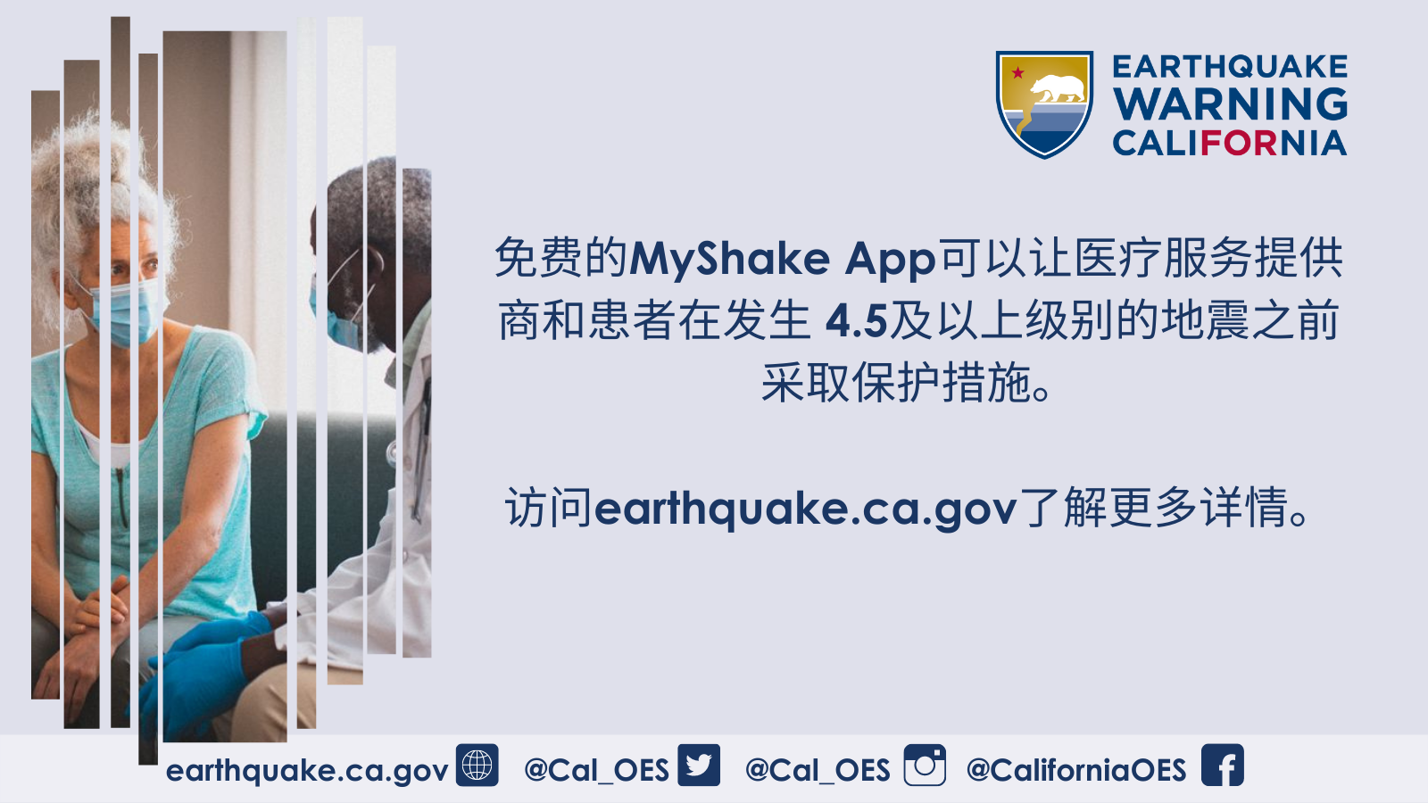 如需了解关于Earthquake Warning California、MyShake App或其他地震预警资源的更多信息,请访问 earthquake.ca.gov。