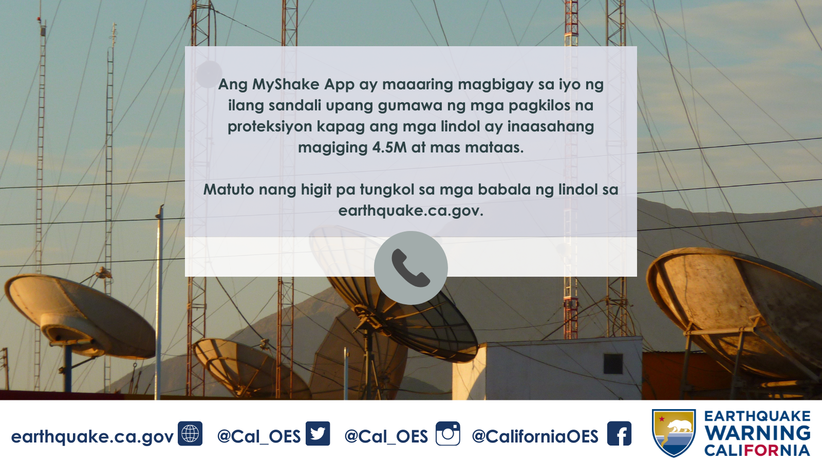 Para matuto ng higit tungkol sa Earthquake Warning California, ang MyShake App, o ibang mga mapagkukunan ng babala ng lindol, bumisita sa earthquake.ca.gov.