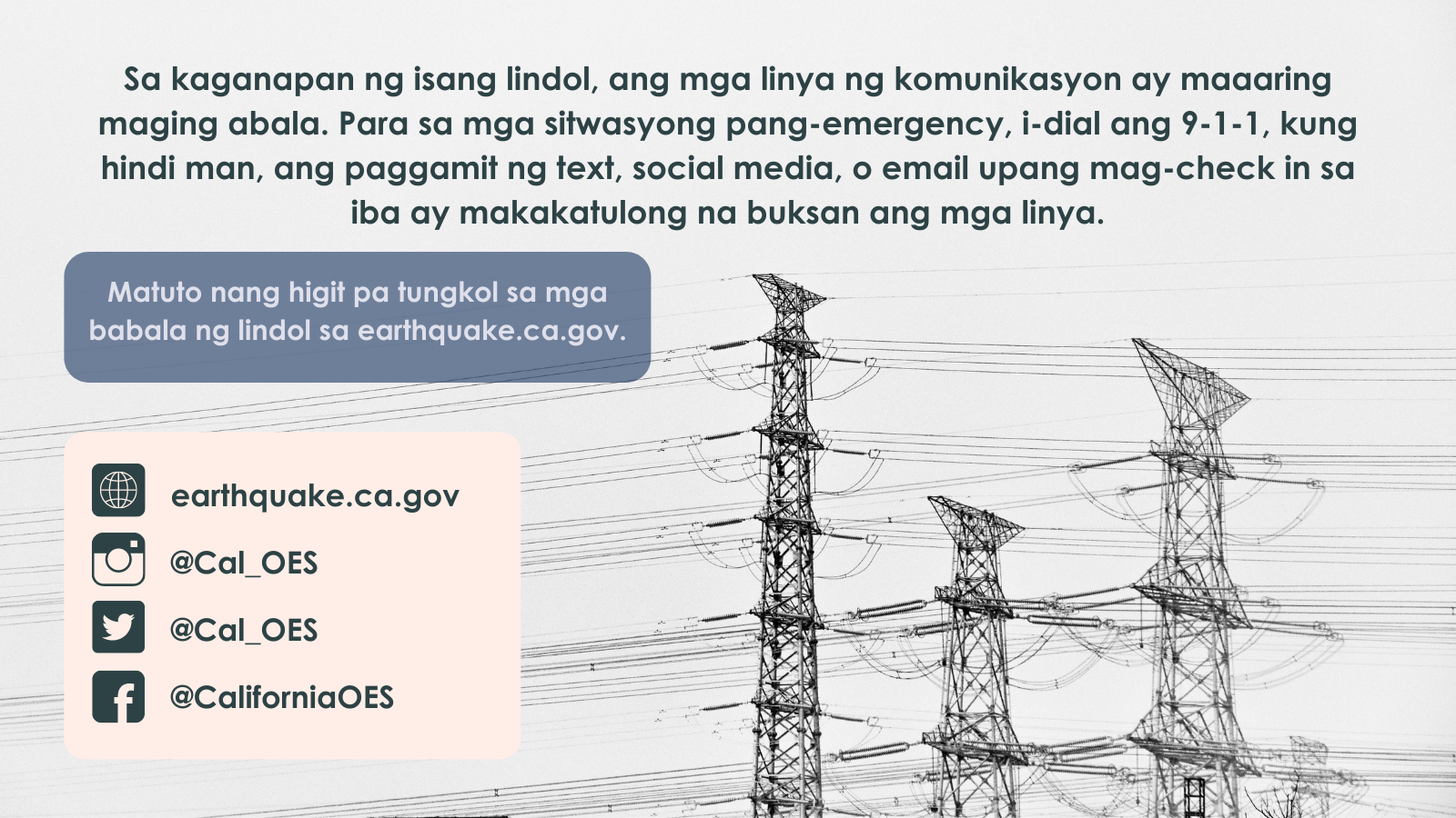 - Sa kaganapan ng isang #earthquake, maaaring maging abala ang mga linya ng komunikasyon. Para sa mga sitwasyong pang-emergency, i-dial ang 9-1-1, kung hindi man, ang paggamit ng text, social media, o email upang mag-check in sa iba ay makakatulong na buksan ang mga linya. Matuto nang higit pa tungkol sa mga babala ng lindol sa earthquake.ca.gov.