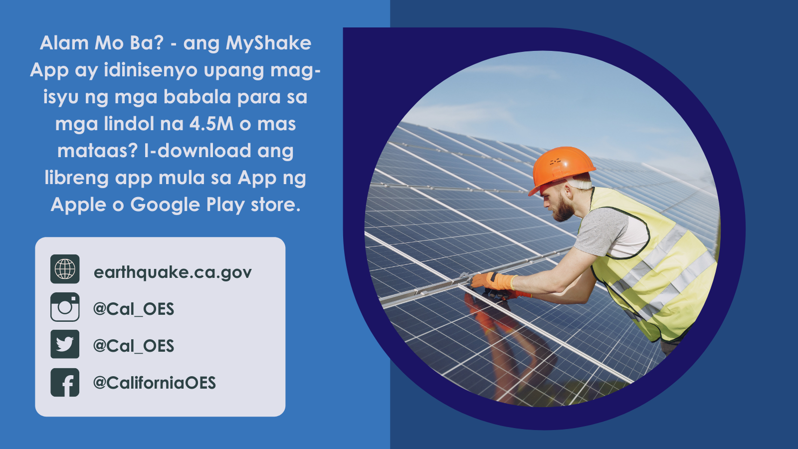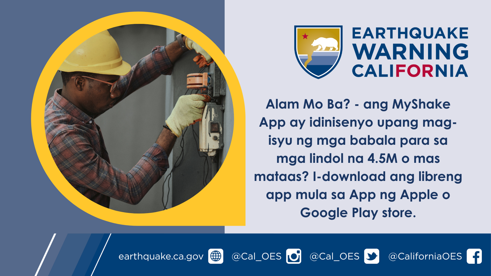 Maaaring maiakma at i-copy paste ang sumusunod sa mga channel ng social media para himukin ang mga follower na i-download ang MyShake App at matuto tungkol sa Earthquake Warning California. Maaari mo ring i-tag ang Cal OES sa iyong post (Twitter: @Cal_OES / Facebook: @CaliforniaOES).