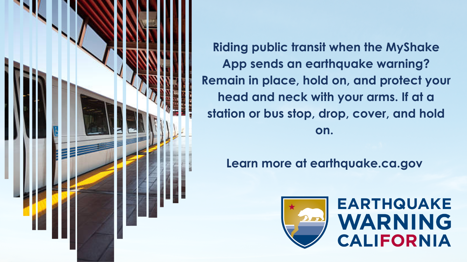 - Earthquakes can strike at anytime, even while you ride public transist. Make your daily commute safer by downloading free resources like the #MyShakeApp learn more at ca.gov