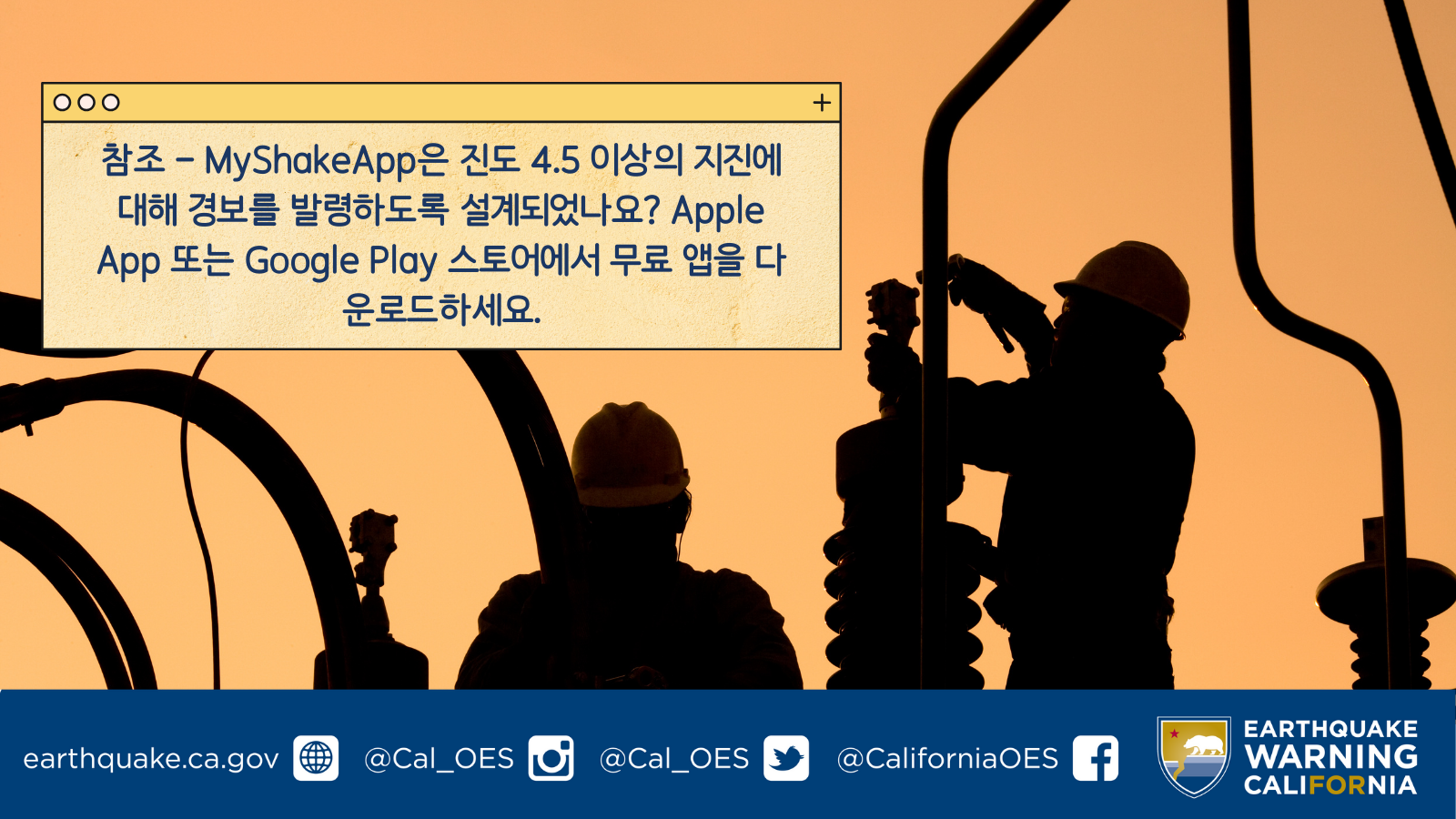 팔로워들이 MyShake App 다운로드하거나 Earthquake Warning California 대해 배울 있도록 다음 내용을 상황에 맞게 수정해서 소셜 미디어 채널에 복사 붙여넣기할 있습니다. 게시물에서 Cal OES 태그할 수도 있습니다(트위터: @Cal_OES/ 페이스북: @CaliforniaOES).