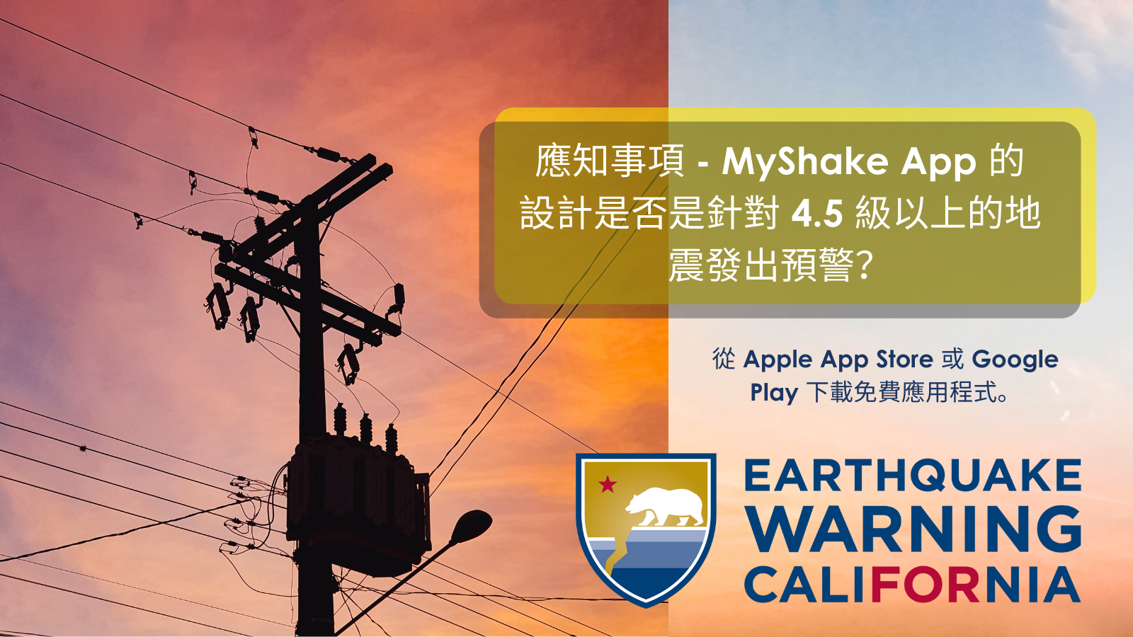 • [單位名稱]很榮幸能參加今年 10 21 日舉行的 Great #California #ShakeOut 演習。 立刻自 Apple App Store Google Play 取得免費的 #MyShakeApp