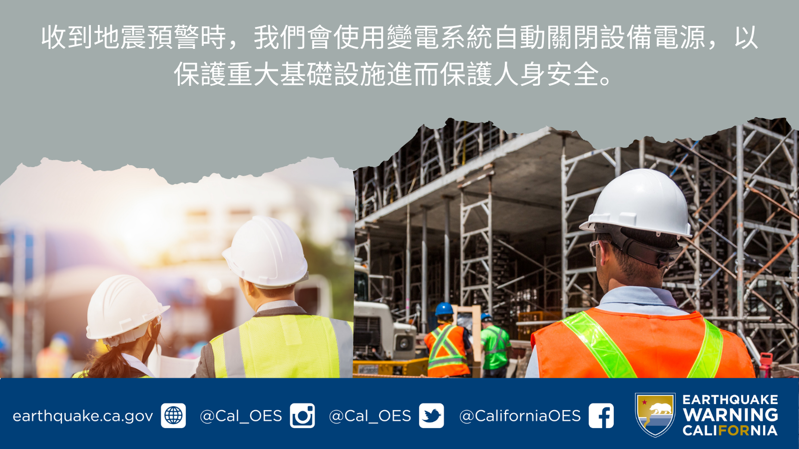 • 收到#地震 預警時,[單位名稱] 會使用變電系統自動關閉設備電源,以保護重大基礎設施進而保護人身安全。 如需更多地震預警的相關資訊,請造訪:earthquake.ca.gov