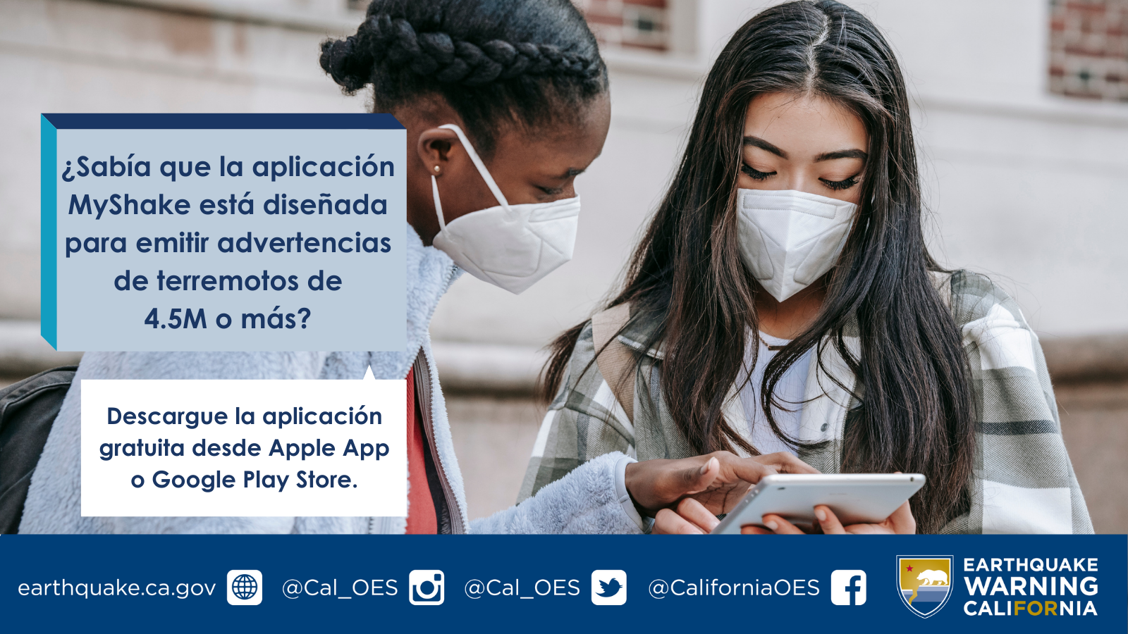 Lo siguiente se puede personalizar y copiar / pegar en los canales de las redes sociales para alentar a los seguidores a descargar la aplicación MyShake y aprender sobre Earthquake Warning California (Advertencia de Terremoto California). También puede etiquetar a Cal OES en su publicación (Twitter: @Cal_OES / Facebook: @CaliforniaOES).
