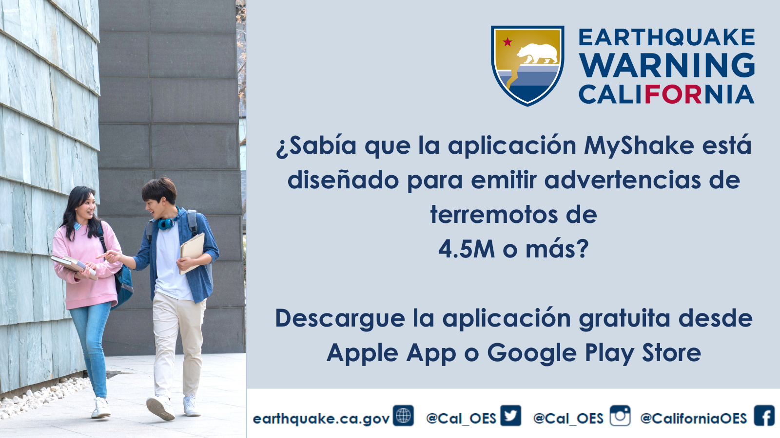 Para obtener más información sobre Earthquake Warning California (Advertencia de Terremoto California), la aplicación MyShake u otros recursos de alerta de terremotos, visite earthquake.ca.gov.